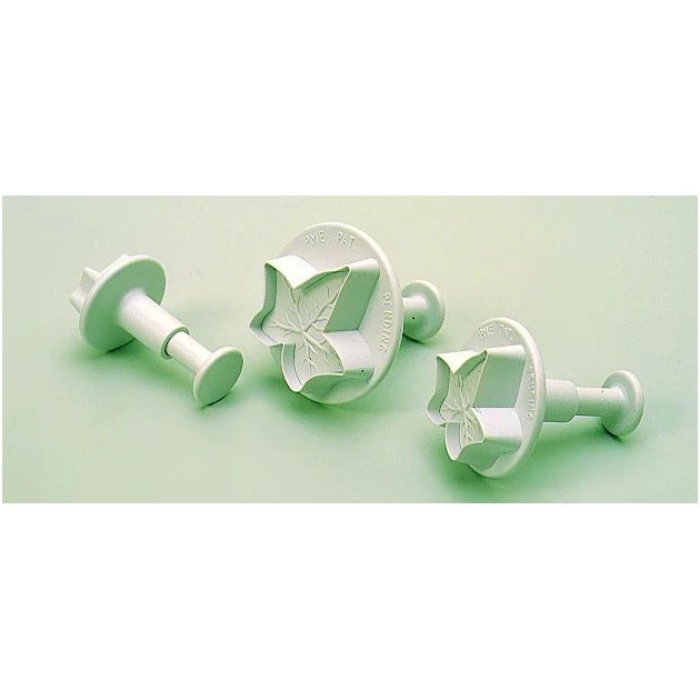 Jeu de 3 Emporte pièces à Poussoir. Le poussoir permet l’extraction facile de la pâte découpée. Ces découpoirs permettent également de marquer sur la pâte les nervures des feuilles.