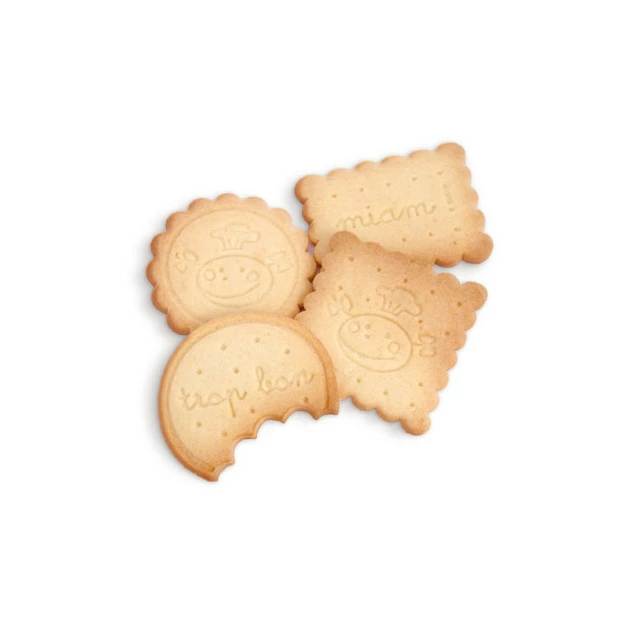 Le kit « Je fais mes biscuits à la confiture » de Scrapcooking est composée de 4 découpoirs éjecteurs ainsi que d’un recette afin de réaliser ses biscuits maison ! Ces emporte-pièces permettent de réaliser 2 formes de biscuits, dont des petits beurres maison ! S’il y a deux formes différentes, chacun des 4 emporte-pièces permet d’ajouter un message ou un dessin différent sur les biscuits.