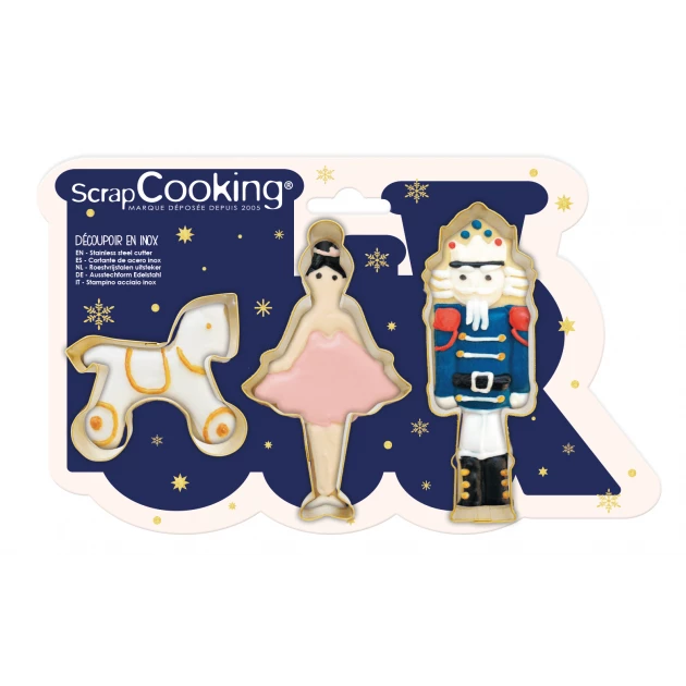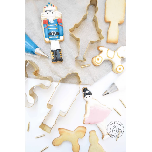 Créer des biscuits originaux sera un jeu d’enfant grâce au lot d’emporte-pièces Scrapcooking. Composé d’inox, les 3 découpoirs de ce lot prennent la forme d’un casse-noisette, d’une danseuse et d’un cheval. Ces designs sont inspirés du célèbre ballet Casse-noisette et vous permettront de confectionner des biscuits sur le thème de ce conte enchanteur.